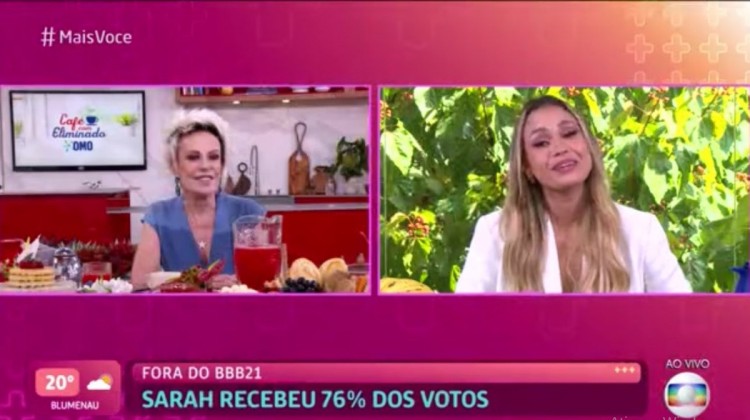 Oitava participante do BBB21 a não resistir ao paredão, Sarah, que deixou o reality com com 76,76% dos votos, fez o tour do eliminado e, nesta quarta, 31, tomou café da manhã com Ana Maria Braga no Mais Você. A ex-sister, apontada como uma das favoritas no início do programa, admitiu que desconfiou da pessoa errada, referindo-se a Juliette, e que seu jogo desandou a partir do momento em que deixou de ouvir seu coração.
